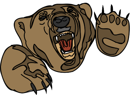 This features a large brown bear with its mouth wide open, showing its teeth and tongue. The bear's paw is raised in the air, giving an impression of playfulness or defiance. The drawing appears to be a cartoonish representation of the bear, possibly for entertainment purposes. The bear's facial expression and body language convey a sense of energy and liveliness, making it an engaging visual piece.