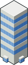 This features a large, tall building with many windows. It is a multi-story structure that appears to be made of concrete or stone. The building has a distinctive blue and white color scheme, which adds an interesting visual element to the scene. The building's design suggests it could be a commercial or office space, given its size and architectural features.