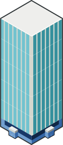 This features a tall, blue and white building with many windows. It appears to be an office building or a similar type of structure. The building is situated in front of a plain background, which provides a clear view of the building's facade. The design of the building suggests that it may have been created using computer-aided design (CAD) software, giving it a clean and modern appearance.