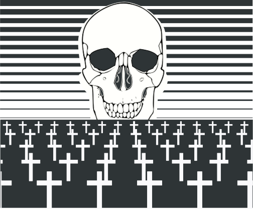 This features a black and white drawing of a skull with crossbones, which is placed above an array of white crosses. The skull appears to be smiling as it looks over the graveyard filled with numerous crosses. The arrangement of the crosses creates a sense of depth in the scene, giving the impression that they are standing on top of one another. This artistic representation of a cemetery evokes a feeling of solemnity and reflection on life's impermanence.