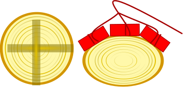 This features a cross and two circles, one of which is a circle with a hole in the middle. These objects are placed on top of each other, creating an interesting visual composition. The circle with the hole appears to be a piece of wood or a disc, while the cross could represent a religious symbol or simply serve as a decorative element. The arrangement of these objects suggests that they might be used for a crafting project or perhaps even for a game involving explosives and cutting materials.