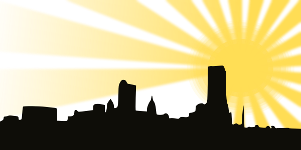 This features a city skyline with a rising sun in the background. The sun is positioned towards the top left of the scene, casting its warm light over the cityscape. In the foreground, there are several buildings that make up the urban landscape. Some of these buildings have distinct shapes and sizes, adding to the overall visual interest of the image. Overall, it's a captivating view of a bustling city during daybreak.