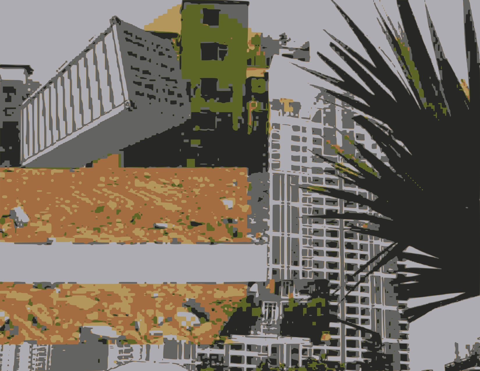 This is a black and white photo of a cityscape with tall buildings. In the foreground, there are palm trees that add to the urban setting. A large building can be seen in the background, along with other smaller structures scattered throughout the scene. The overall composition creates an interesting contrast between the natural elements of the palm trees and the man-made structures of the cityscape.
