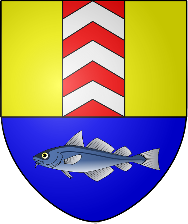 This features a coat of arms with a fish on it. The fish is prominently displayed in the center, surrounded by a blue and yellow background. The coat of arms also has red and white stripes, adding to its visual appeal. This design could be associated with Boudry or another entity that uses this particular symbol. Overall, the image showcases an intricate and eye-catching emblem.