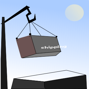 This features a large box hanging from a crane, which is suspended in the air. The box has the word "shipping" written on it, indicating that it might be related to shipping or transportation services. The scene appears to take place during daytime, as there are no visible clouds in the sky. The overall atmosphere of the image suggests a sense of movement and activity, possibly related to the transportation industry.