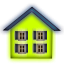 This features a yellow house with green trim, which has a distinctive triangular shape. It is a two-story home with a total of six windows on the second floor and four on the first floor. The windows are arranged in a way that allows for natural light to fill the space while maintaining privacy. The house's color scheme creates an inviting atmosphere, making it an attractive place to live or visit.