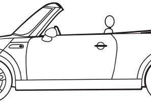 This features a black and white drawing of an open car, likely a convertible. It is seen from the side view, with the front end of the vehicle prominently displayed. The car has a black outline, giving it a clear and defined appearance. The drawing captures the essence of the car without any color, emphasizing its shape and structure.