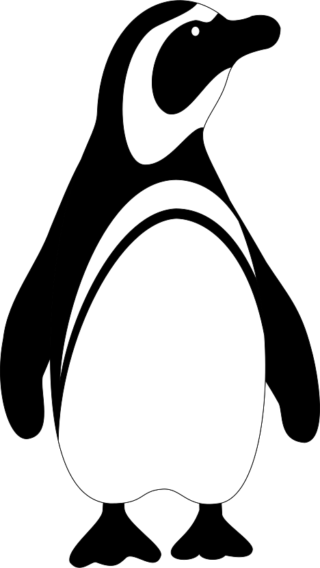This features a black and white penguin standing on two feet, with its head turned to the side. It appears to be looking at something off-camera. The penguin is positioned in the center of the image, taking up most of the frame. The contrasting colors of the penguin make it stand out against a light background, giving it a bold and eye-catching appearance.