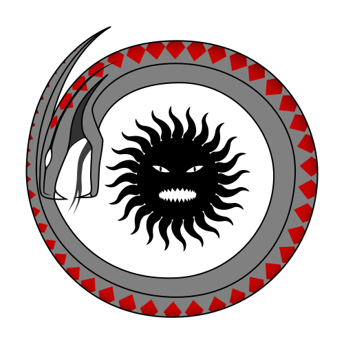 This features a black and white circular design with an evil face in the center. This face is surrounded by a snake that appears to be biting its own tail, creating a striking visual effect. The snake's body is adorned with red patterns, adding a touch of color to the otherwise monochromatic scene. The overall composition of this design gives it an intriguing and mysterious appearance.