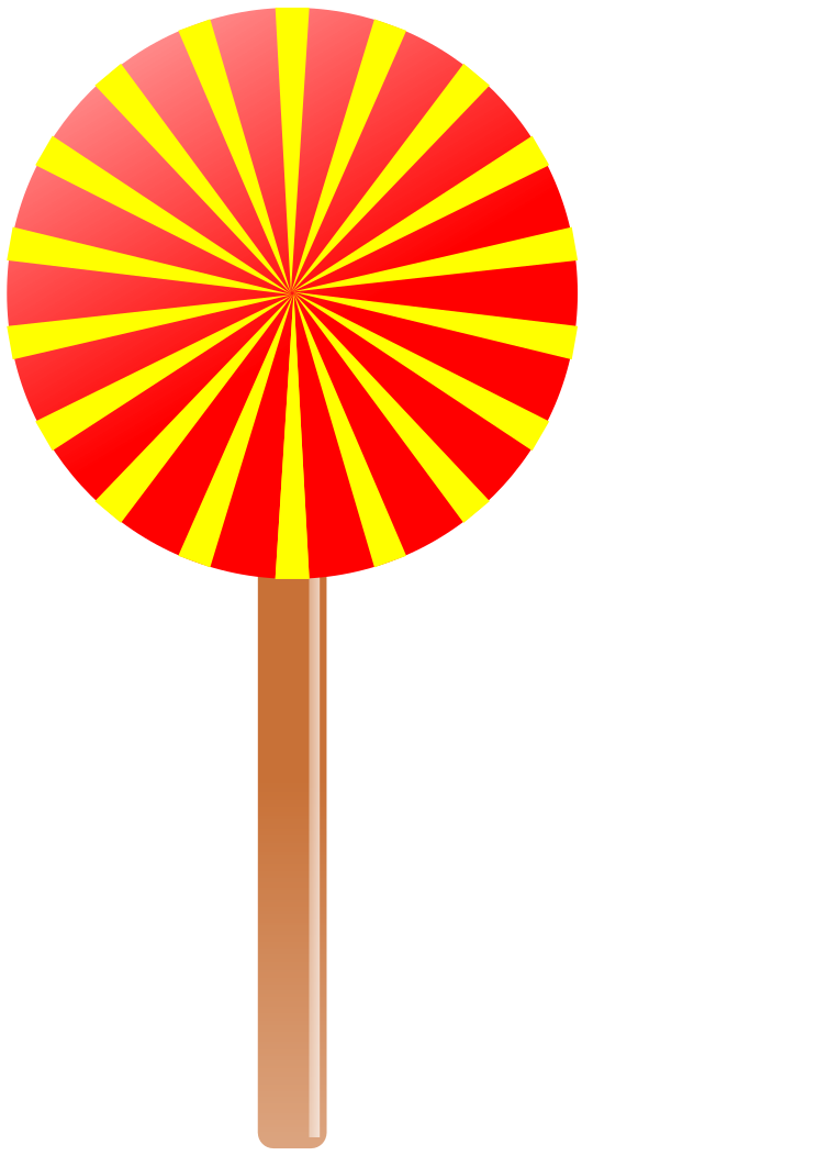 This features a colorful lollipop with a yellow and red spiral pattern. It is placed on top of a wooden stick, giving it the appearance of a candy cane. The vibrant colors and unique design make this lollipop stand out as an eye-catching treat.