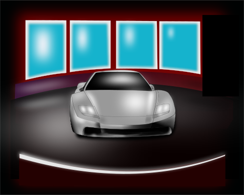 This features a stylized drawing of a car in a display area. The car is prominently displayed on the floor, surrounded by four windows that are illuminated with red lights. This creates an eye-catching and dramatic atmosphere for the vehicle showcased within the space. The car appears to be the main focus of the scene, drawing attention towards it as a centerpiece in this display area.