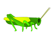 This features a green and yellow cartoon insect, possibly a grasshopper or a beetle. It is standing on its hind legs with its front legs raised in the air. The insect's body is large and occupies most of the frame, while its head is positioned towards the right side of the image. The color scheme of green and yellow gives it an appealing and vibrant appearance.