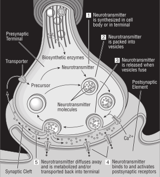 This is a diagram of the human brain, with various labels describing its different parts and functions. It shows the brain's structure, including the cerebrum, cerebellum, brainstem, and other regions. There are also descriptions of the brain's functioning, such as the role of neurons in transmitting signals, the process of synaptic transmission, and the different types of neurotransmitters that affect mood and behavior. The diagram is labeled with numbers, indicating specific areas or functions within the brain. Overall, it provides a detailed view of the human brain's structure and functioning.