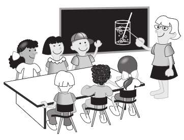 This depicts a classroom setting with several children sitting around a table, attentively watching their teacher. The teacher is standing in front of the board and pointing to an illustration of a science experiment. There are multiple chairs placed around the table, some occupied by students while others remain empty. A cup can be seen on the table, possibly containing a drink for one of the students. The scene captures the essence of learning and collaboration in a classroom environment.