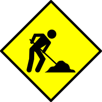 This features a yellow sign with an illustration of a man shoveling dirt. The man is wearing a hard hat and appears to be working on a construction project or digging up the ground. The sign serves as a warning for people in the area, indicating that there might be ongoing work or potential hazards related to the activity. The illustration of the man shoveling dirt adds a visual element to the sign, making it more engaging and easier to understand for those who see it.