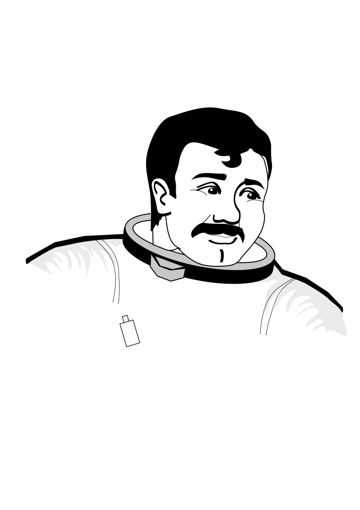 This features a black and white drawing of an astronaut wearing a space suit. He is looking directly at the viewer, giving off a sense of confidence and determination. The astronaut's suit appears to be well-fitted and functional, with all necessary equipment visible for his mission. The drawing captures the essence of a true space explorer, ready to embark on an exciting journey into the unknown.