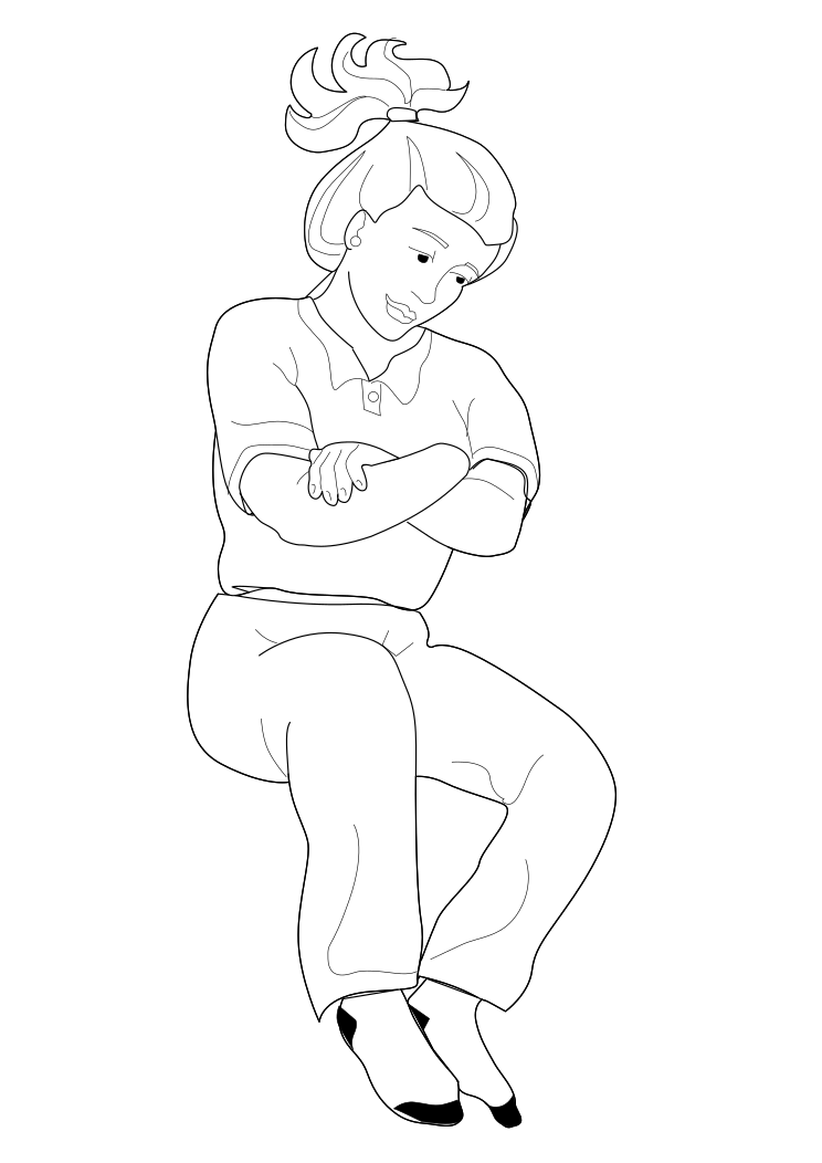 This features a woman sitting down with her arms crossed. She is wearing a white shirt and appears to be looking at the camera. Her posture suggests that she might be in deep thought or simply relaxing. The drawing of this woman has been done in black and white, giving it an artistic and classic feel.