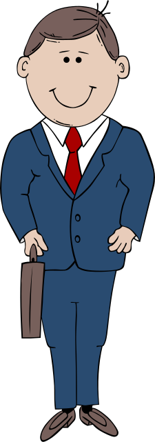 This features a cartoon drawing of a man dressed in a suit and tie, standing with his hands in his pockets. He is smiling at the camera, giving off an impression of confidence and professionalism. The man's attire includes a blue jacket, which complements his overall appearance. Additionally, he holds a briefcase in one hand, further emphasizing his business-oriented demeanor. This illustration captures the essence of a successful businessman with a friendly and approachable personality.