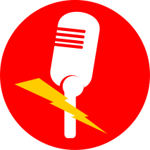 This features a red circle with an icon of a microphone inside. The microphone is white and has a yellow lightning bolt symbol next to it, giving the impression that it's being used for recording or broadcasting purposes. This design could be used in various contexts such as advertising, technology, or entertainment.