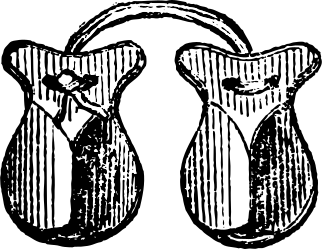 This is a black and white etching of castanets originally in the Illustrated London News from 1870. It features two castanet handles, each with a bell attached to it. These castanets are designed for playing music, and they have been drawn in an artistic manner. The image captures the essence of these musical instruments and their historical significance.