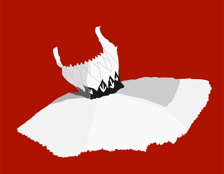 This features a white frilly ballet dress with a black bow on top, placed against a red background. The dress appears to be in the process of being worn or removed, as it is partially uncovered and has a slightly messy appearance. The red background provides a striking contrast to the delicate white fabric of the dress, drawing attention to its details.