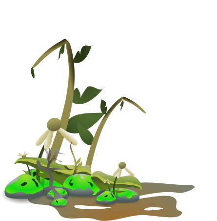 This features a green plant with a few leaves and stems, growing in a puddle of water. The plant is surrounded by rocks that are also covered in the same bright green slimy substance. There are two small plants located near the main plant, one on the left side and another on the right side. Additionally, there are three frog-like creatures in the scene, with one situated between the main plant and the left plant, another close to the right plant, and a third one further away from the other two. The overall atmosphere of the image suggests an environment affected by pollution or contamination.