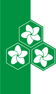 This features a green and white flag with three white flowers on it. These flowers are arranged in a triangular pattern, creating an eye-catching design. The flag is displayed against a light brown background, which adds depth to the overall appearance of the image. This unique combination of colors and patterns makes for an interesting visual display.