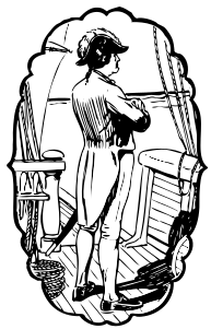 This is a black and white drawing of a British sea captain standing on the deck of his ship, looking out to sea. He appears to be wearing a suit and tie, which adds an element of formality to his attire. The scene takes place in front of a chair, suggesting that this might be a formal gathering or event taking place on board the ship. The overall atmosphere of the drawing is one of elegance and sophistication, reflecting the captain's status as a respected figure within the maritime community.