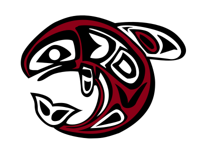 This features a large, colorful fish with red and black designs on its body. It appears to be an artistic representation of a fish, possibly inspired by Native American culture or the Pacific Northwest region. The fish is prominently displayed in the center of the image, taking up most of the frame. Its vibrant colors and intricate patterns make it stand out against the white background.