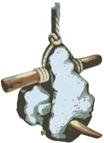 This features a unique piece of artwork that combines the elements of an anchor and a rock. In the center, there is a large white rock with a rope tied around it, giving the appearance of being hung or suspended in mid-air. Surrounding this central object are several smaller rocks, some of which have been painted to resemble hands. The overall composition creates a visually interesting and creative piece that combines natural elements like rocks with man-made objects such as ropes and paintings.