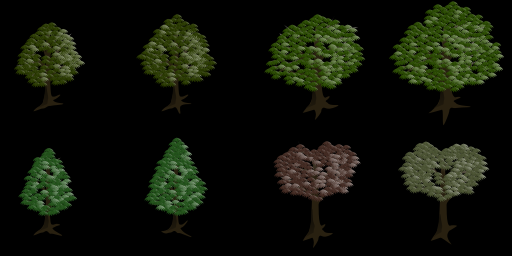 This features a collection of six different trees, each with varying colors and sizes. They are arranged in two rows, with three trees on the left side and three trees on the right side. Each tree is depicted at various stages of growth, showcasing their unique characteristics. These sets of isometric tree are handy to be used in any isometric games or other artistic projects that require a diverse range of tree designs.