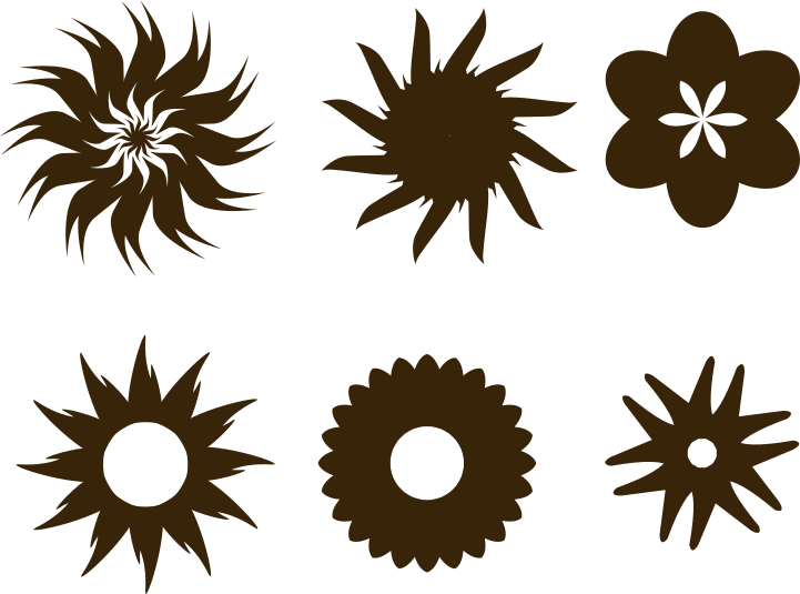 This features a collection of six different black floral designs. These designs are arranged in a row, with each one showcasing unique patterns and shapes. They appear to be cut out from a larger picture or illustration, giving them an artistic and visually appealing appearance. Each design is distinctive, making the image interesting and engaging for viewers who appreciate various styles of floral patterns.