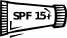 This features a black and white drawing of an SPF 15+ sunscreen bottle. The bottle is prominently displayed in the center of the picture, with its label clearly visible. The drawing appears to be a cartoon or comic style representation of the product, making it visually appealing and easy to understand for viewers. This image could potentially be used as an advertisement or educational tool to promote sun protection and the importance of using SPF products.