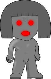This features a cartoon-like character with a large head and a body that is almost entirely naked. The character has red eyes, which are glowing in the darkness, giving it an eerie appearance. It appears to be a female figure, as indicated by its distinctive facial features. The character's expression seems somewhat distressed or angry, adding to the overall intriguing nature of the image.