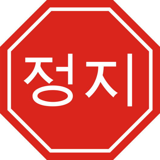 This features a red stop sign with the word "jeongji" written in Korean. This unique design makes it stand out from typical English-language stop signs, as it only displays the foreign language text without any accompanying English words. The sign is prominently displayed and takes up most of the frame, making it an eye-catching focal point. It's unclear how this particular design might be used in practice, but its distinctive appearance certainly makes it a memorable sight.