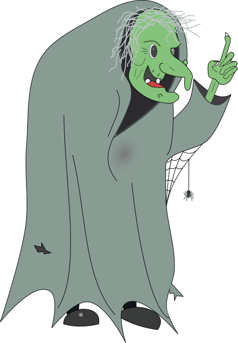 This features a green witch with a scary appearance, wearing a black cape and pointing her finger at the viewer. She has white hair and is smiling, giving off an eerie yet friendly vibe. The witch's outfit includes a spooky design that adds to her overall creepy charm.