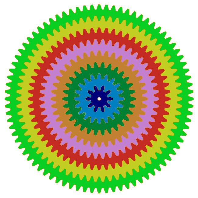 This features a large, colorful circle made up of many smaller circles. Each small circle is filled with different colored gears that are placed inside one another. There are at least ten distinct gears visible in the image, each varying in size and positioned within the larger circle. The combination of these gears creates an intricate and visually appealing pattern, showcasing a variety of colors and shapes. This unique design could be used for various purposes such as decoration or even as a functional component in mechanical devices.