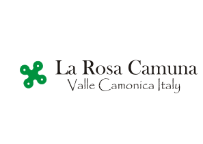 This features a white and green logo for La Rosa Camuna, which is written in Italian. The name of the company appears to be "La Rosa Camuna Valle Cammomoria Italy." The logo has an interesting design with four green circles arranged around the text, creating a visually appealing appearance.