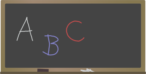 This features a chalkboard with the letters A, B, and C written on it. These letters are in different colors, making them stand out against the black background of the board. There is also an eraser located near the top left corner of the board, ready for use when needed. Additionally, there is a piece of chalk placed towards the right side of the board, likely to be used for writing or drawing on the surface. The overall scene gives off a classic and educational vibe, reminiscent of a traditional classroom setting.