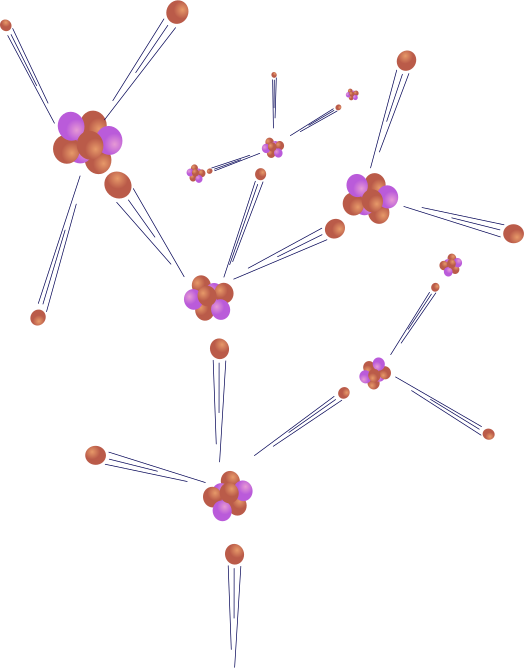 This is a stylized representation of the concept of chain reaction, specifically at the atomic level. It features a series of purple and orange atoms connected by long lines, creating an artistic interpretation of nuclear fission by neutrons. There are multiple purple and orange atoms in various positions throughout the scene, with some closer to the center while others are more towards the edges. The overall composition gives off a sense of energy and movement, capturing the essence of the chain reaction concept.