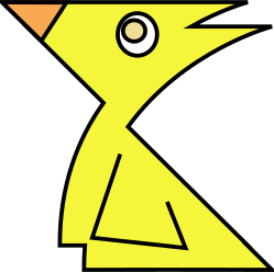 This features a yellow bird with an odd shape, resembling a letter K. It is standing on one leg and appears to be looking at the viewer. The bird's body occupies most of the frame, while its legs are positioned towards the bottom right corner. The overall composition of the image gives it a playful and whimsical appearance.
