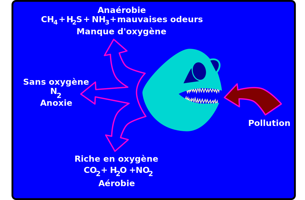 This is a blue background with a cartoon drawing of an aquatic creature, possibly a fish or a whale. This creature has its mouth open and appears to be eating something. There are several arrows pointing towards the creature, indicating different aspects related to it. The text on the image reads "Antoine" in one corner and "Pollution" in another. The drawing also includes words like "Oxygene," "CO2 + H2O," "Aerobe," and "Rich en Oxygen." These terms are likely related to the creature's anatomy or its role in the ecosystem. Overall, the image is a combination of artistic expression and scientific information about aquatic life and their relationship with pollution.