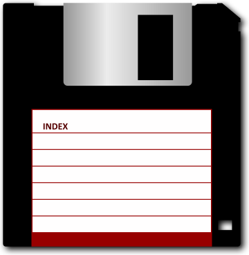 This features a computer floppy disc with the word "Index" written on it. The disc is placed in an open case, and its label is red and white. The disc appears to be old-fashioned, possibly from the 1980s or earlier. This type of floppy disc was commonly used for storing data and transferring files between computers during that time period.