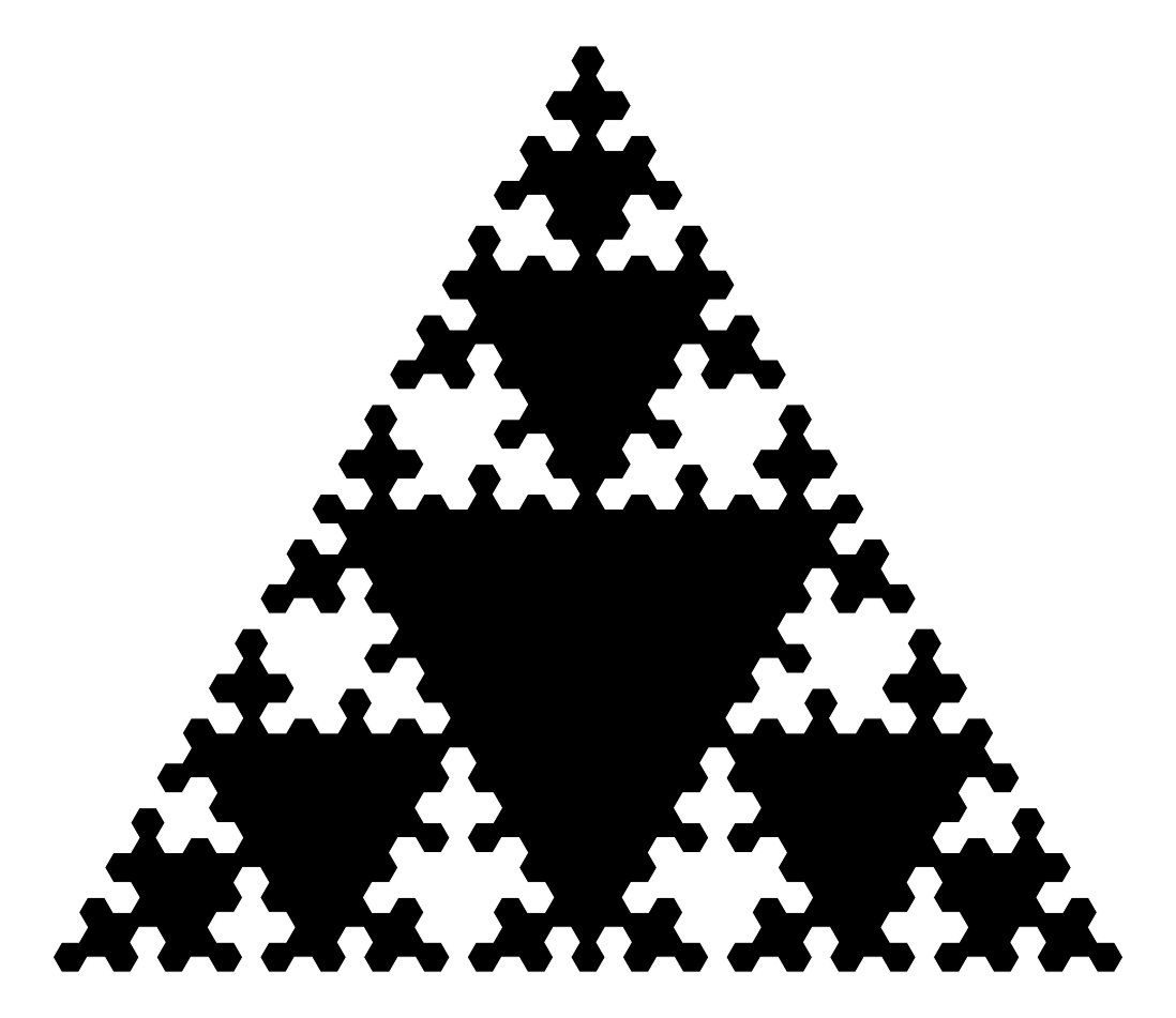 This features a black and white geometric pattern, which appears to be an intricate design. This pattern is reminiscent of the famous Sierpinski Triangle, a fractal shape that consists of repeating triangles. The triangle in this case has been created using L-Systems, resulting in a complex yet visually appealing pattern. The black and white color scheme adds an artistic touch to the design, making it stand out as a unique piece of art or decoration.