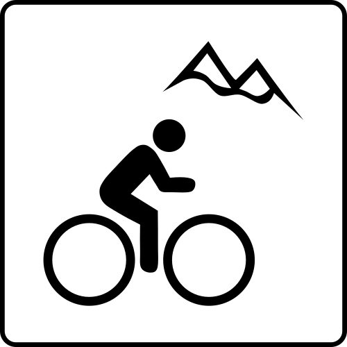 This features a black and white sign with an illustration of a person riding a bicycle. The cyclist is depicted in the middle of the scene, holding onto the handlebars as they ride up a hill. In addition to the main cyclist, there are two smaller figures on either side of the main one, possibly representing other riders or people accompanying them on their journey. The sign also includes an illustration of mountains in the background, adding to the overall atmosphere and setting of the scene.