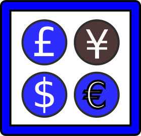 This features a blue square with four different colored circles inside of it. Each circle represents a different currency, including the Euro (€), Pound Sterling (£), Dollar ($), and Yen (¥). These symbols are arranged in a neat row within the blue square, making for an organized display of various currencies. The arrangement showcases the diversity of global money systems and their respective values.