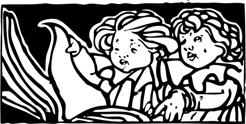 This features two children, a boy and a girl, sitting together on a book. They are both holding the same book in their hands, seemingly enjoying a shared reading experience. The scene is depicted in black and white, giving it an old-fashioned feel. The children appear to be engaged with each other as they read the book, creating a sense of companionship between them.