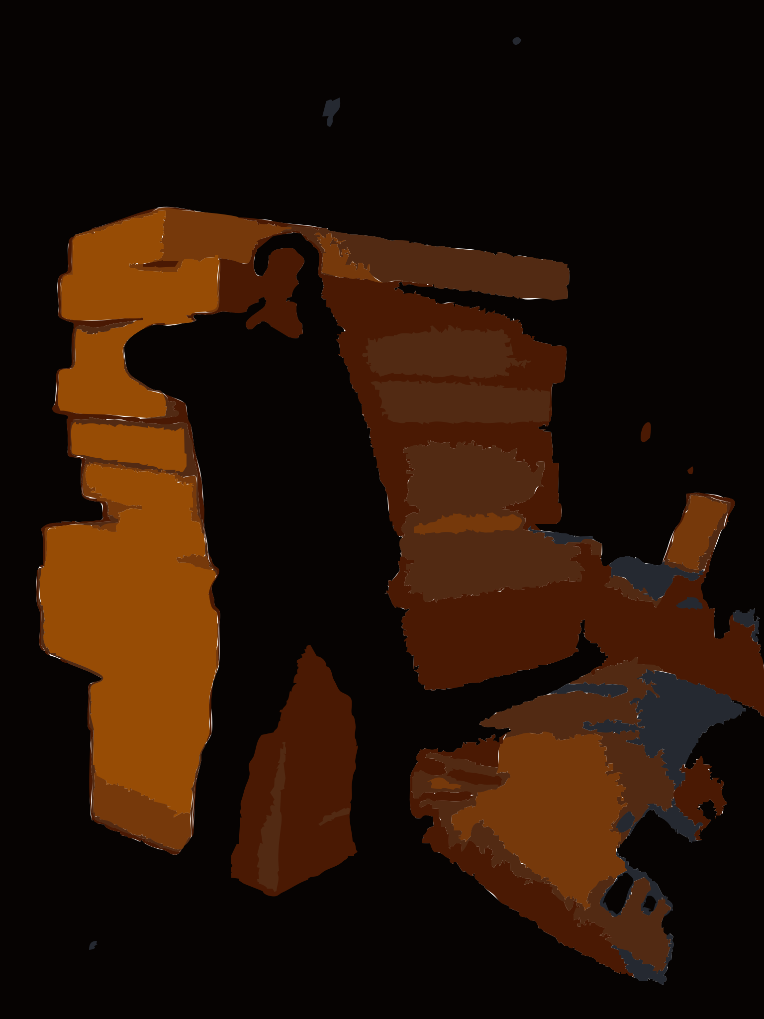 This features a man standing in front of a pile of cardboard boxes. He appears to be looking up, possibly admiring the stack or contemplating his next move. There are several boxes surrounding him, with some placed higher than others. In addition to the main subject, there is another person visible on the right side of the image, but they are not as prominent and seem to be in the background. The scene gives off a sense of organization and preparation for a task or event involving the cardboard boxes.