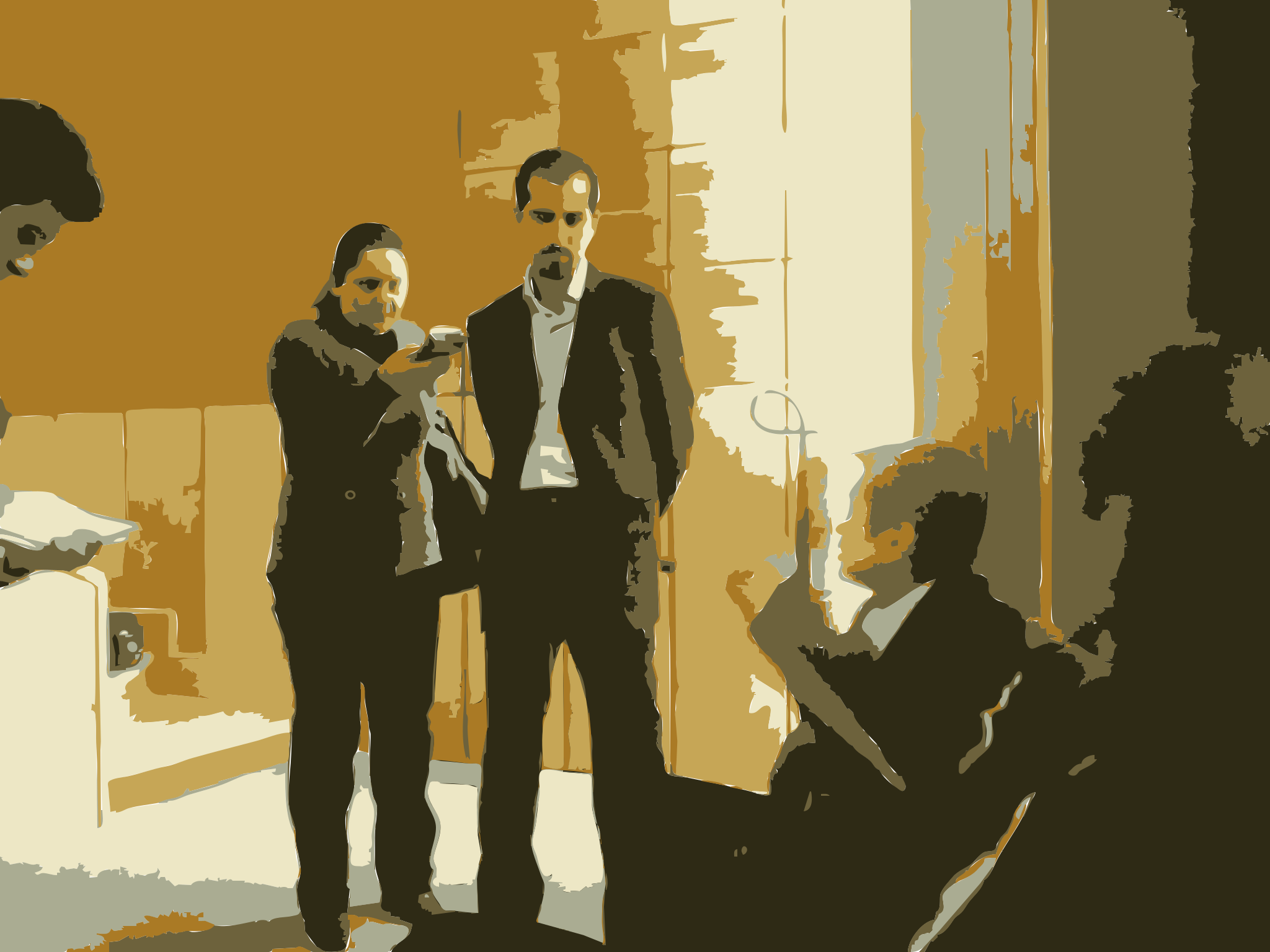 This is a black and white photo of three people standing in a room. One man is wearing a suit, while the other two are dressed more casually. They appear to be engaged in conversation or observing something together. In the background, there is a chair visible near the right side of the scene.