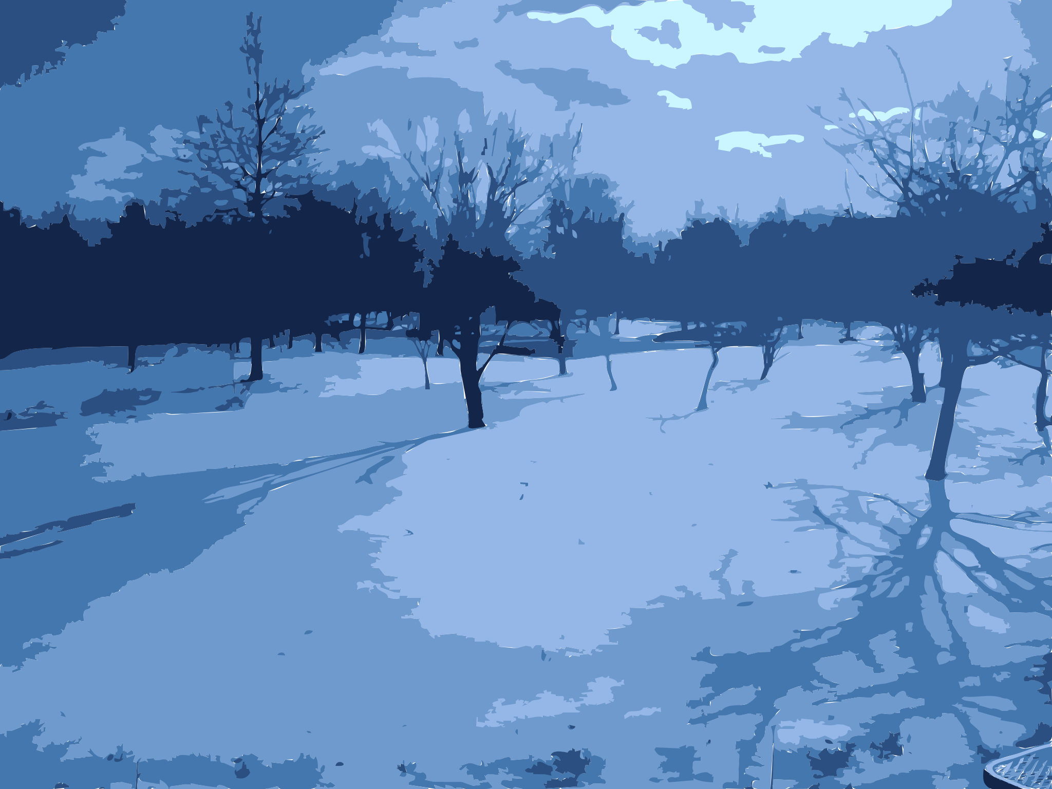 This is a blue and white photo of a snowy field with trees in the background. There are several trees scattered throughout the scene, some closer to the foreground while others are further away. The sky appears to be cloudy, adding an atmospheric touch to the winter landscape. The overall effect of the photo is a serene and peaceful atmosphere, capturing the beauty of nature during the colder months.